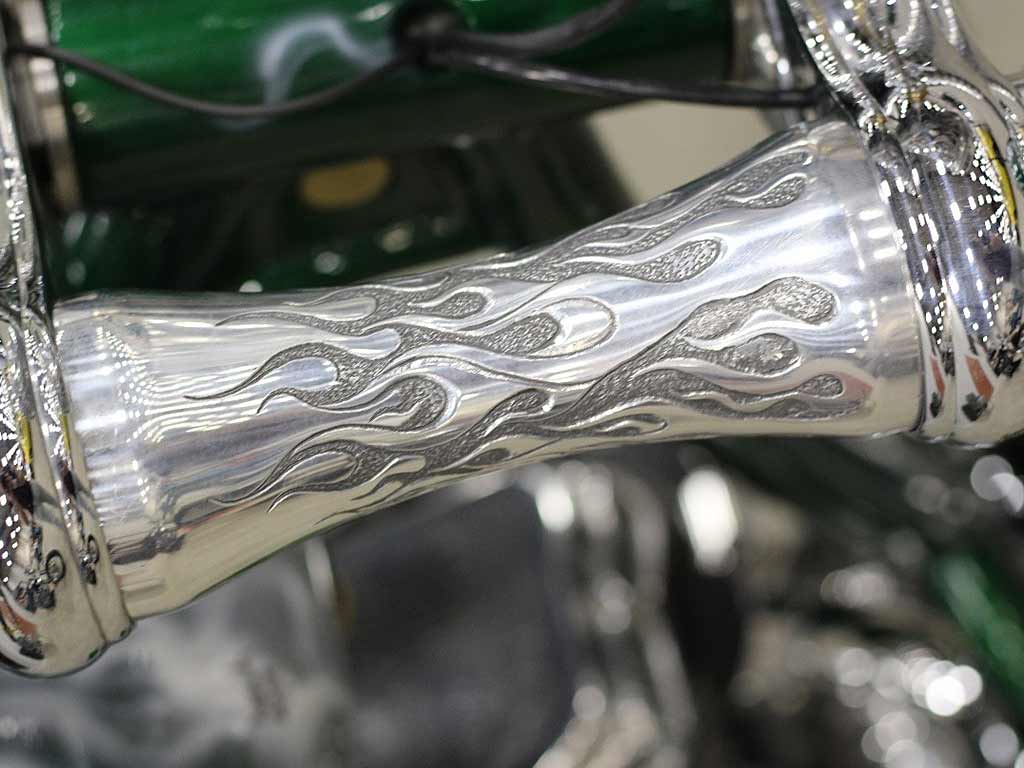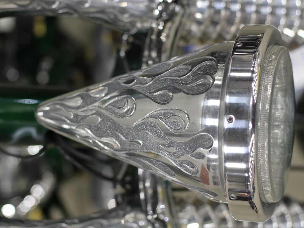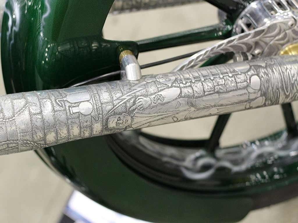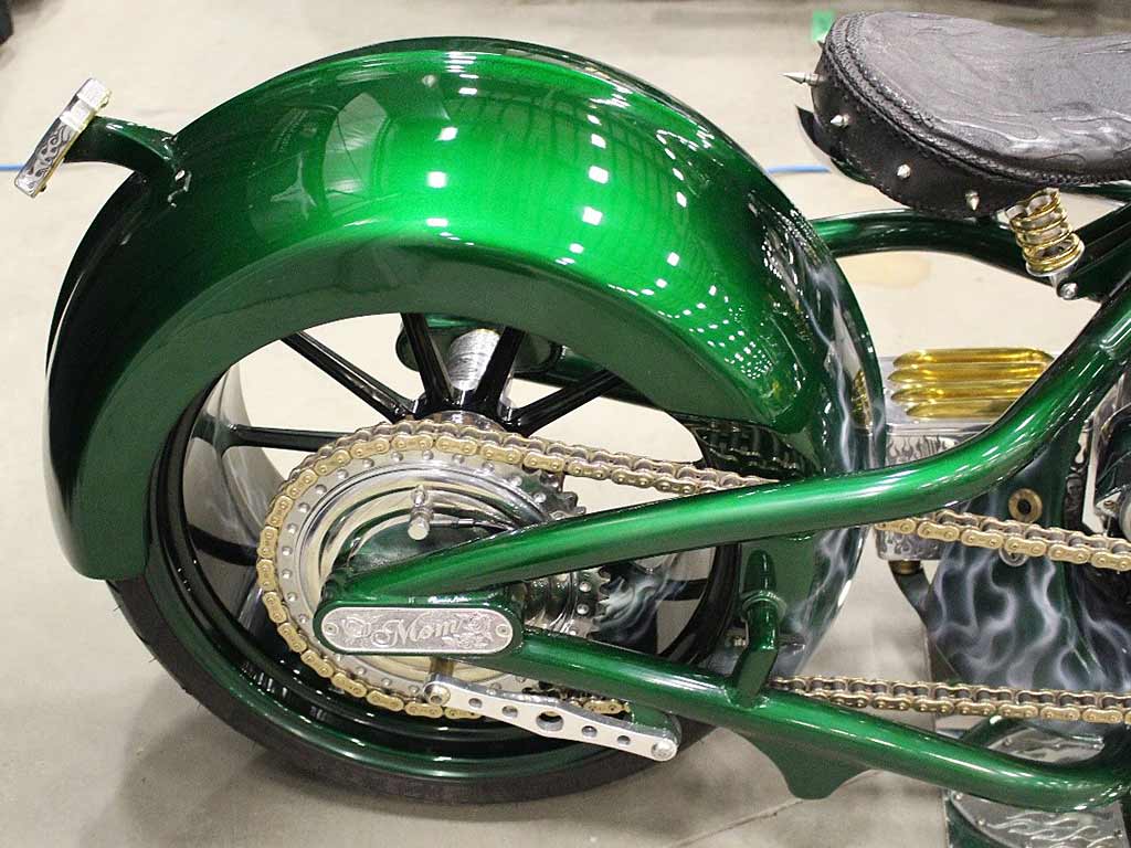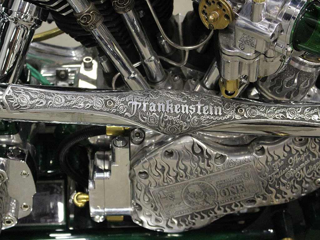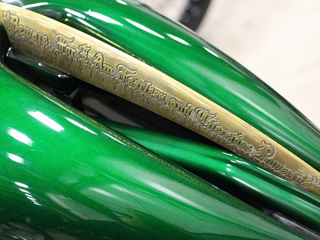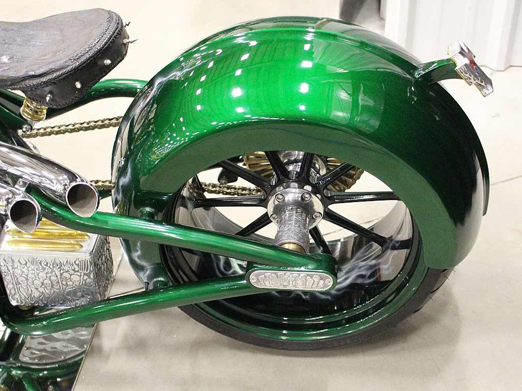 Rims/Tires: The motorcycle has a custom built rear rim with extra wide tire, along with the custom built matching front rim/tire combination. The motorcycle will have great precise handling capabilities from operator input and will have true road surface steering on the Highway. Both rims received a full hand laid flame paint job, enhancing the details for this exceptional built bike.
