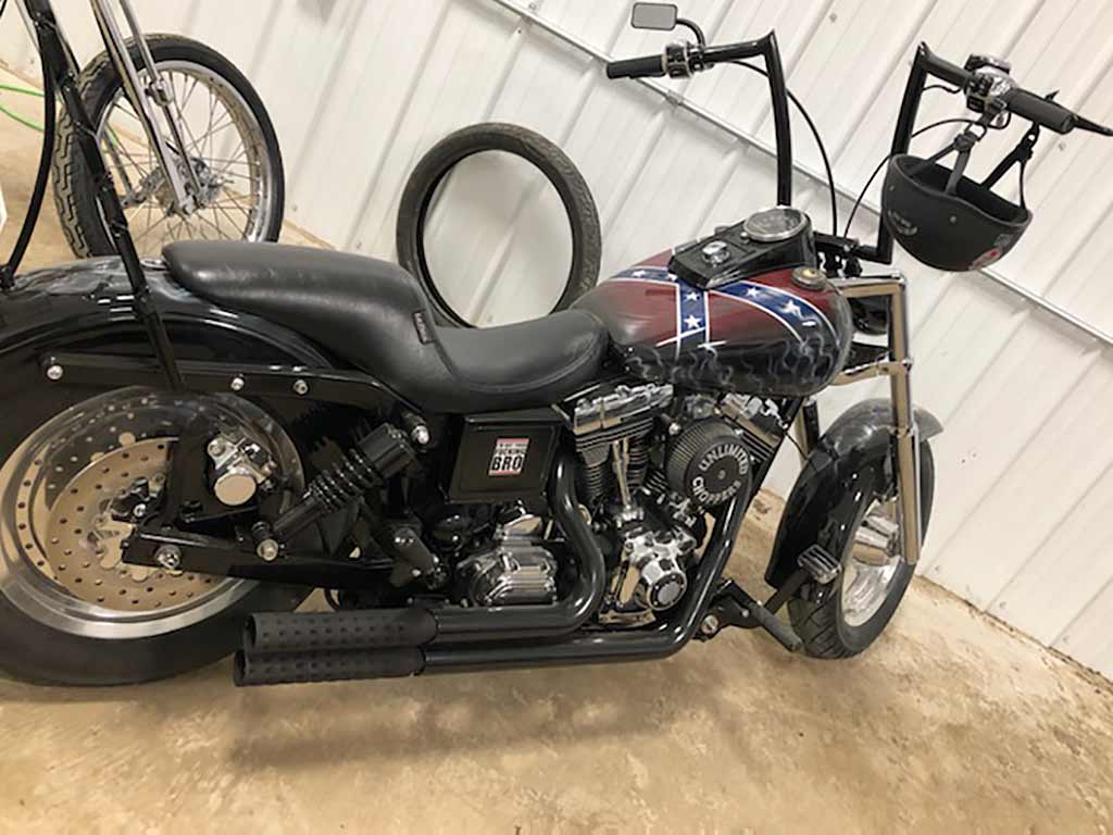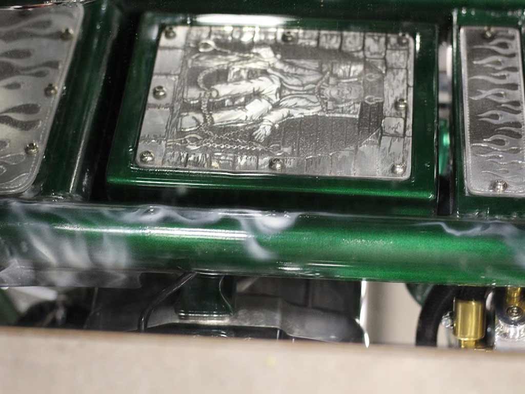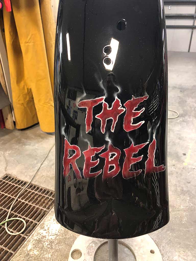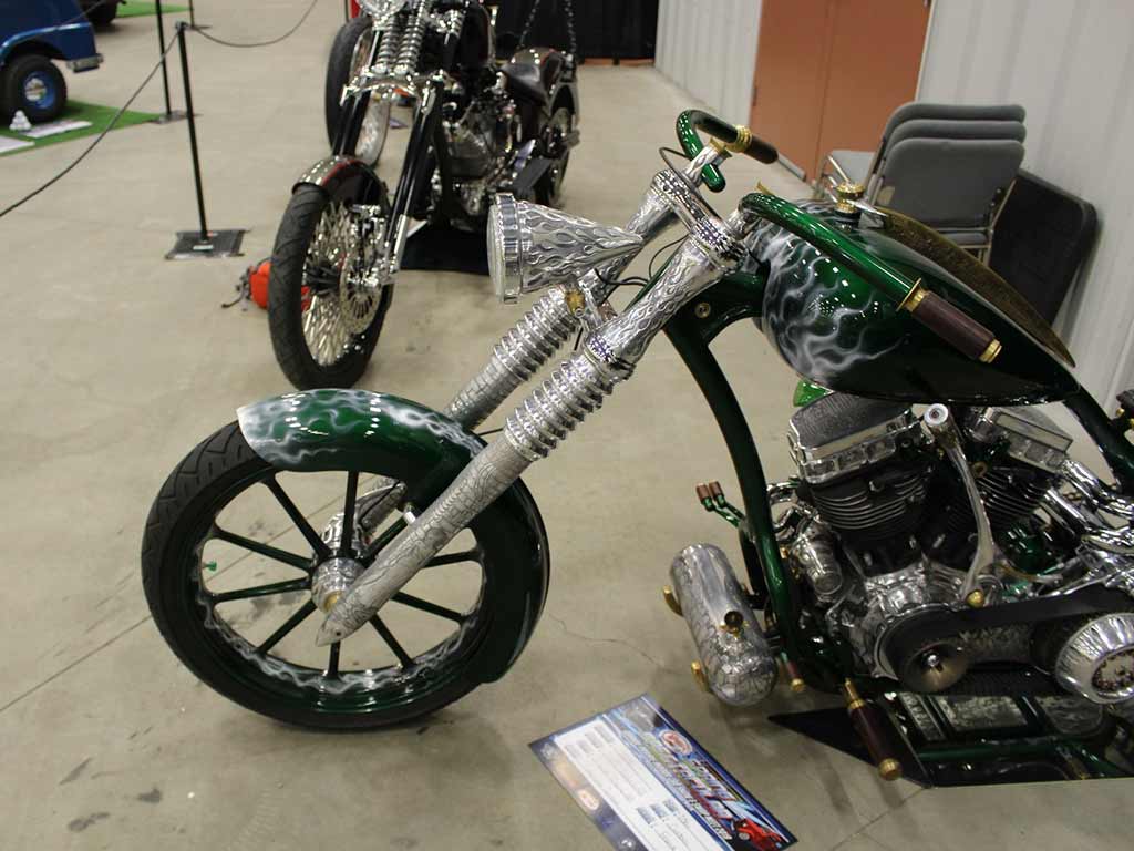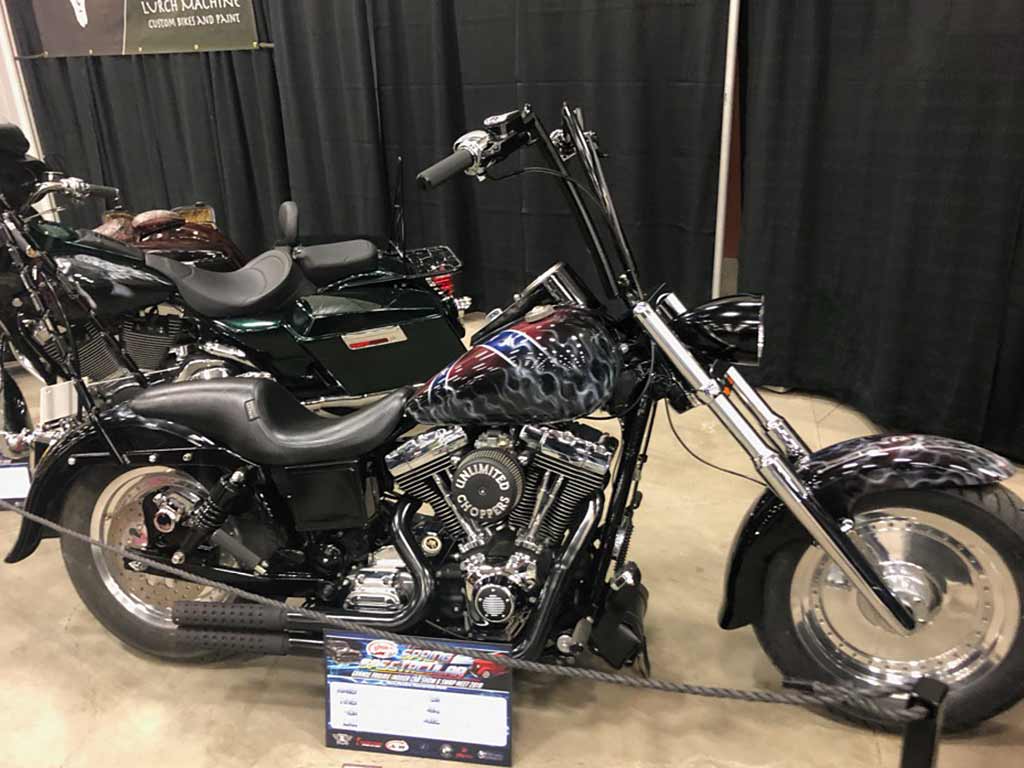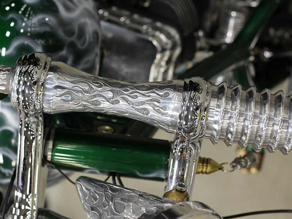 Rims/Tires: The motorcycle has a custom built rear rim with extra wide tire, along with the custom built matching front rim/tire combination. The motorcycle will have great precise handling capabilities from operator input and will have true road surface steering on the Highway. Both rims received a full hand laid flame paint job, enhancing the details for this exceptional built bike.