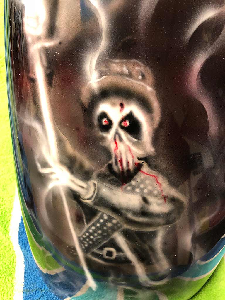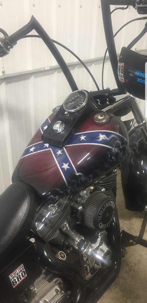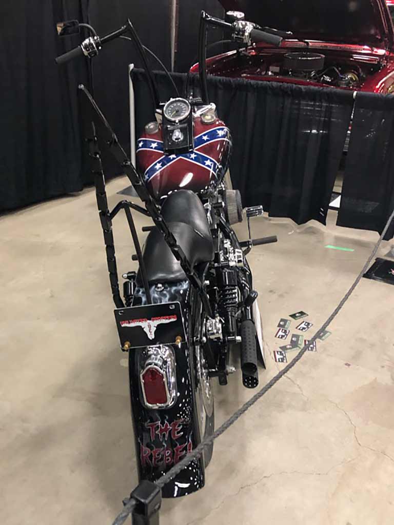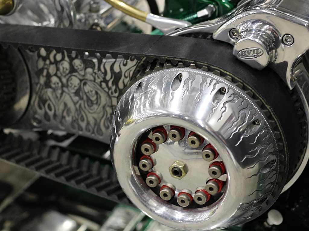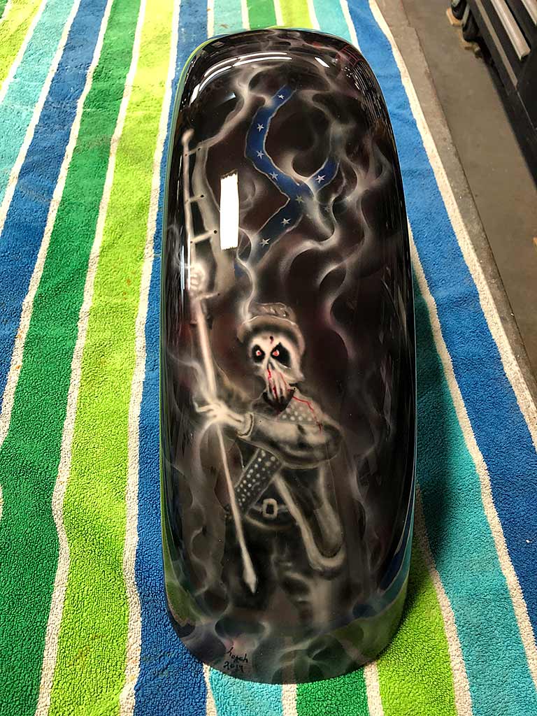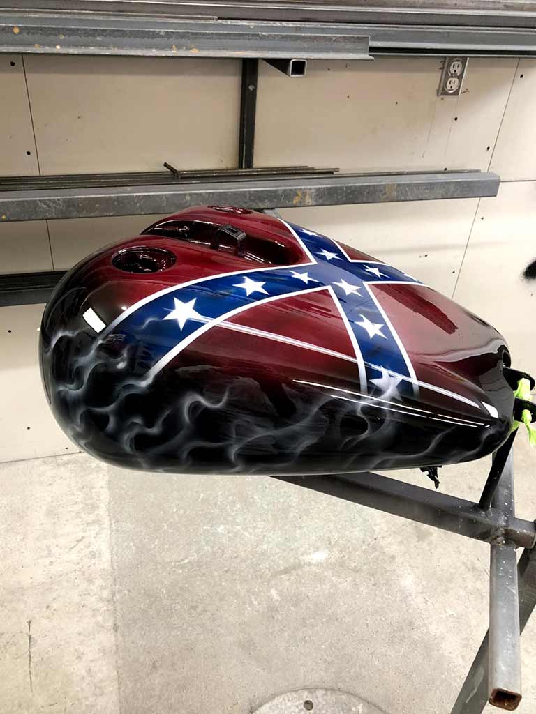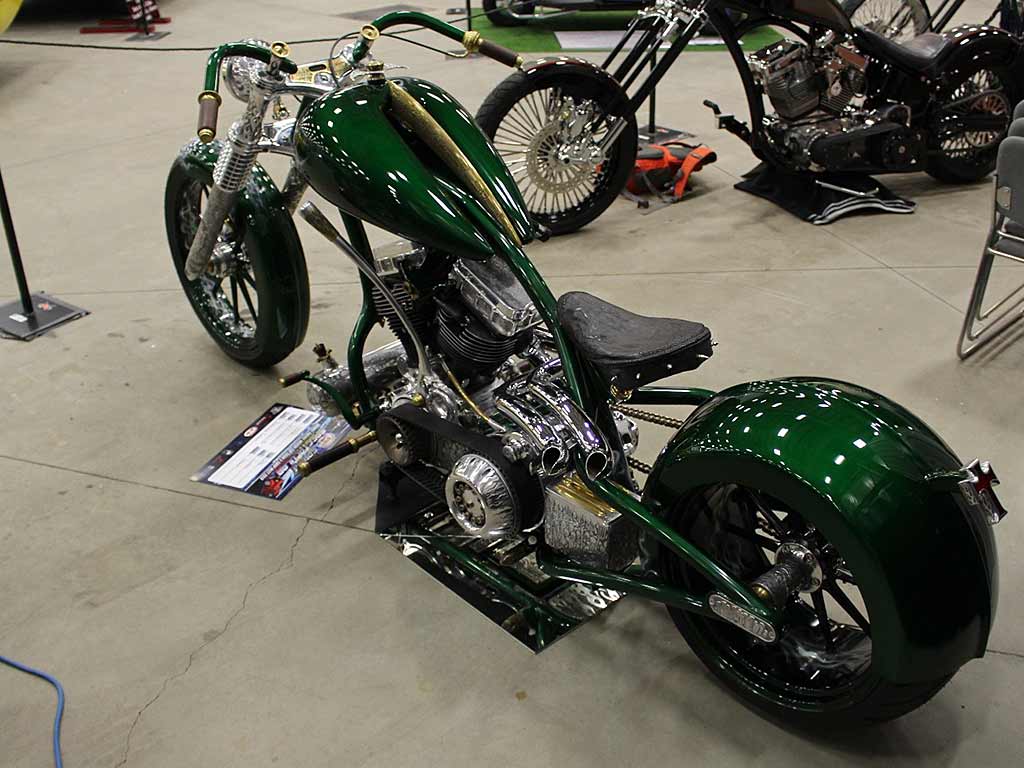 Rims/Tires: The motorcycle has a custom built rear rim with extra wide tire, along with the custom built matching front rim/tire combination. The motorcycle will have great precise handling capabilities from operator input and will have true road surface steering on the Highway. Both rims received a full hand laid flame paint job, enhancing the details for this exceptional built bike.